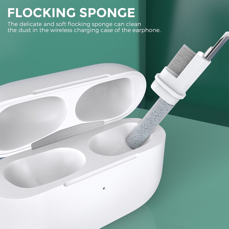 Soft flocking sponge cleans dust from the cordless charging case of the headphones.