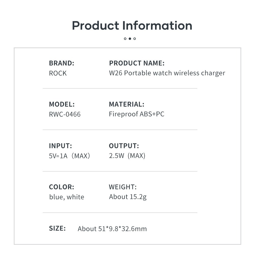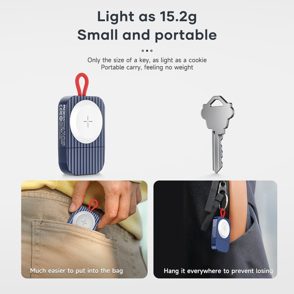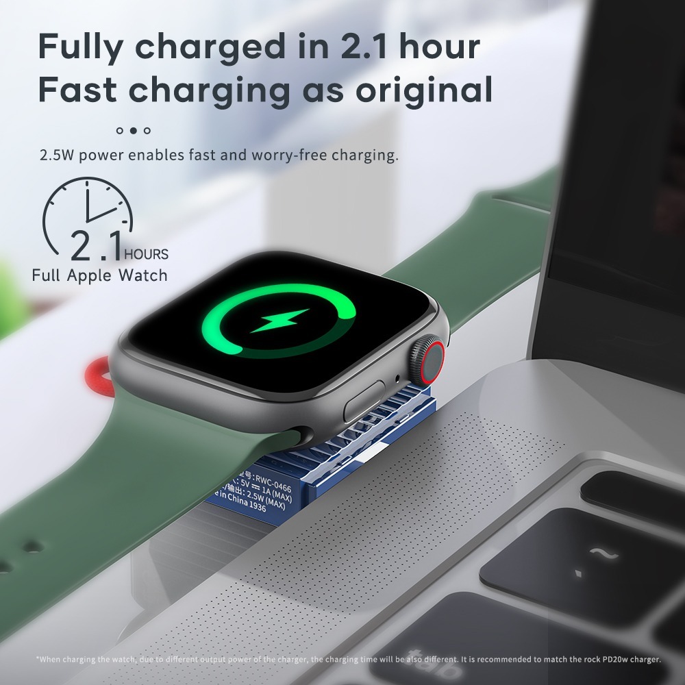 Rock Mini Portable Magsafe Watch Charger is a wireless charger compatible with Apple watch 1-5 generations, contains magnetic positioning automatic adsorption, fully charged without heating. 2.5W high power charging, only 2.5 hours to be fully charged, and a soft light indicator, working status