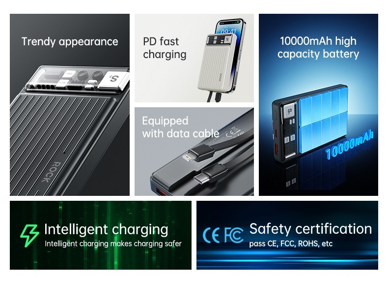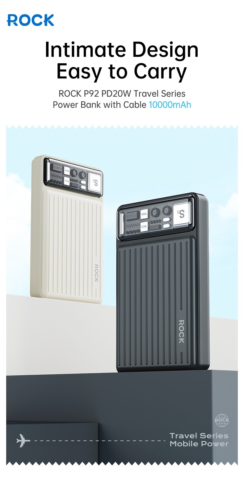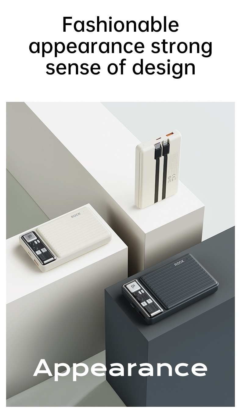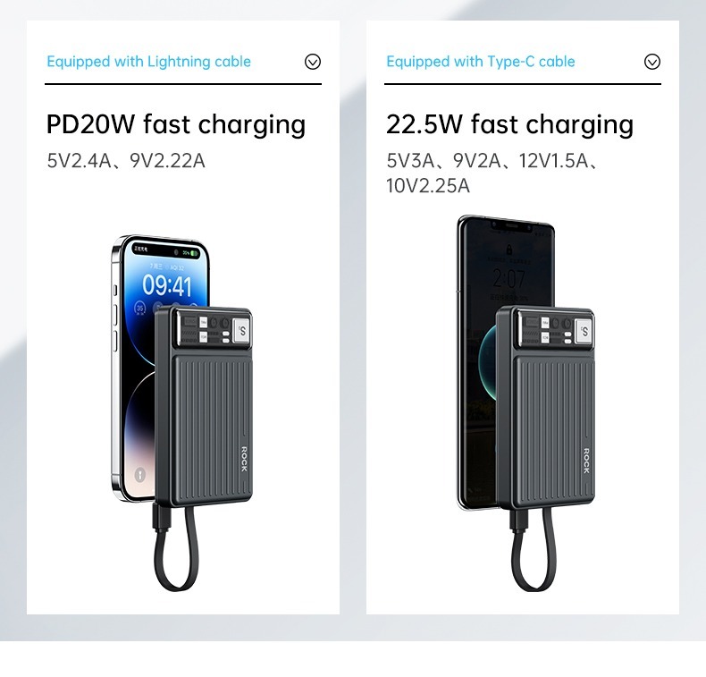 The Rock-P92 10000mAh Ultrabook with Cord PD20W is a stylish, self-contained data cable mobile power supply with an extra large 10000mAh battery. Simple design, easy to store, high elasticity cable body is flexible and tensile. It supports type-c, 22.5W fast charging, lightning, PD20W fast charging.
