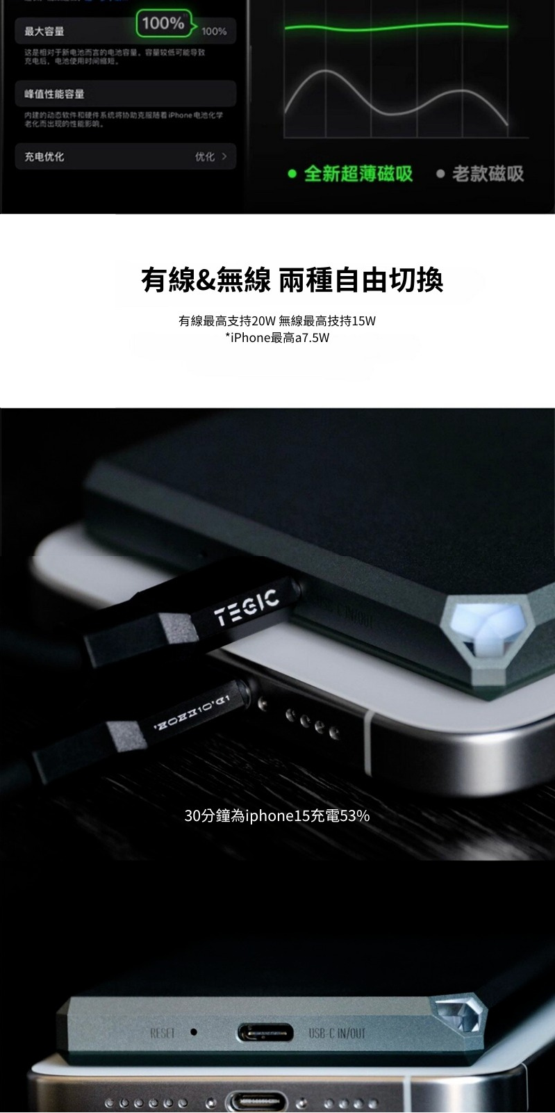 Breathing LED indicator to monitor battery level/ Aluminum alloy CNC cover/ Wireless charging supports up to 15W / Wired charging supports up to 20W.