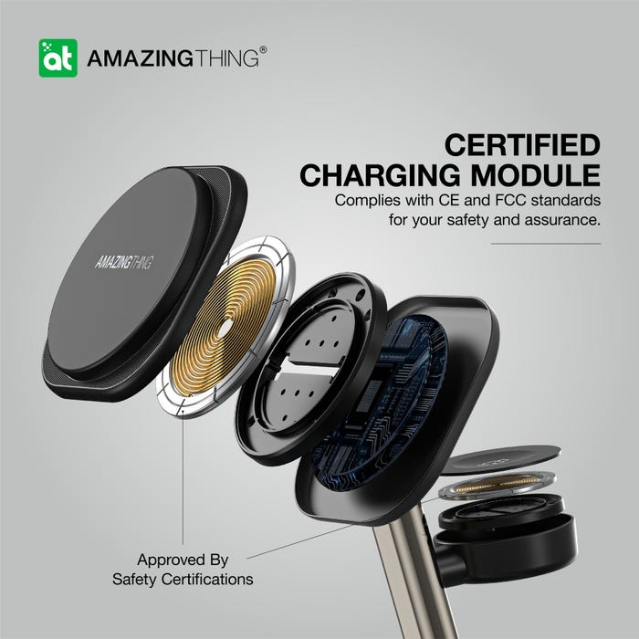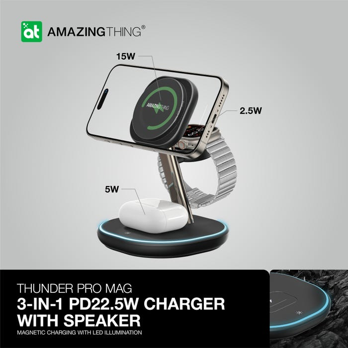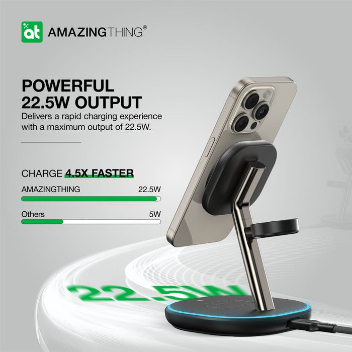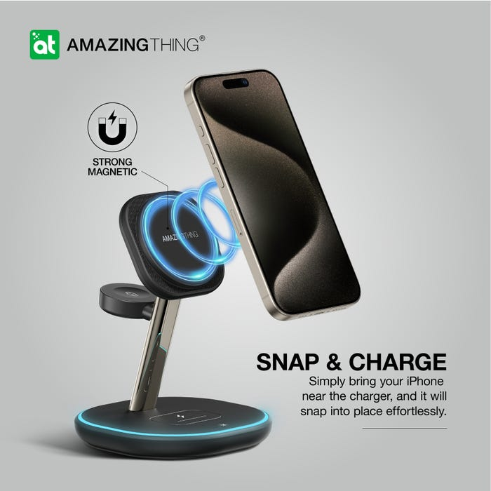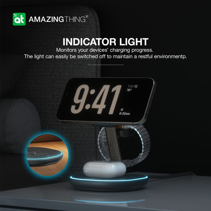3合1:可同時為 iPhone、Apple Watch 或 AirPods 充電,簡化您的充電程序。卡入式充電:只需將 iPhone 靠近充電器,它就會毫不費力地卡入到位。強大的 22.5 瓦輸出功率: 最大輸出功率 20.5W,帶來快速充電體驗。指示燈:監控設備的充電進度。指示燈可輕松關閉,以保持安靜的環境。經過認證的充電模塊: 符合 CE 和 FCC 標準,確保您的安全。