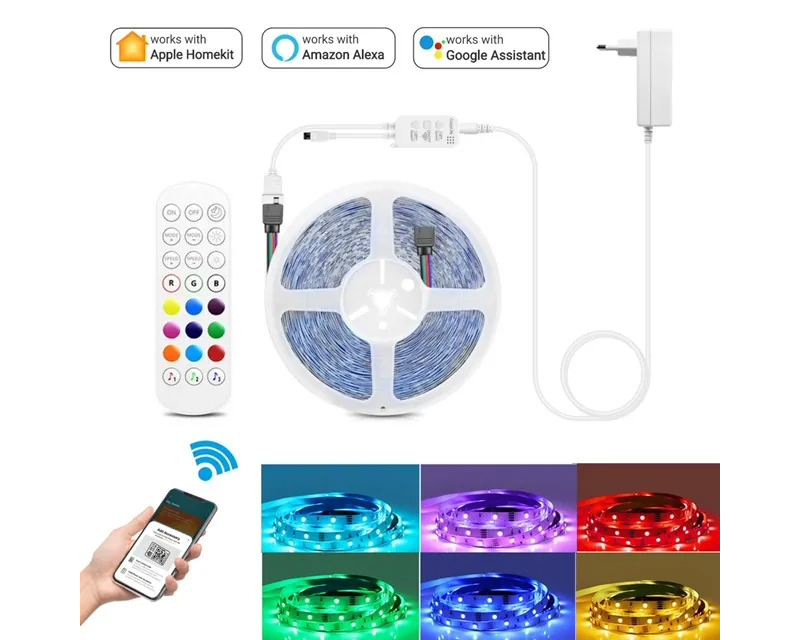 Apple HomeKit 智能 WiFi LED 燈帶,5米長,支援 RGBCW 全彩色與冷暖白光,搭配英式電源頭設計。通過 Siri、iPhone 或 iPad 輕鬆操控,實現語音控制與場景自動化,打造智能家居氛圍燈光。