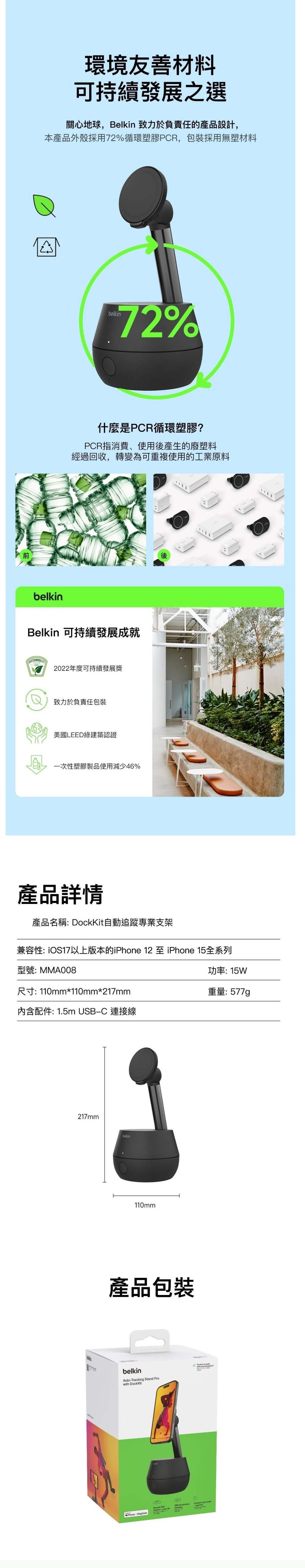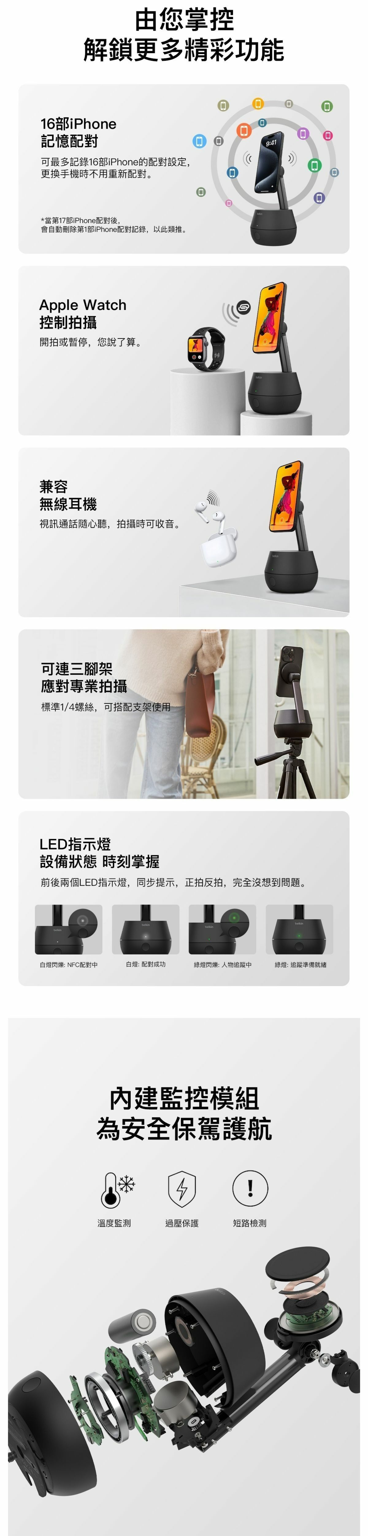 使用我們的Belkin DockKit 自動追蹤手機支架進行 FaceTime 通話或拍攝內容時,請留在畫面中。 使用 DockKit 進行 360° 旋轉和 90° 自動傾斜可確保您始終處於拍攝狀態。 此外,還可透過 15W 快速無線充電保持電量充足。 輕鬆與您的 iPhone 配對即可開始