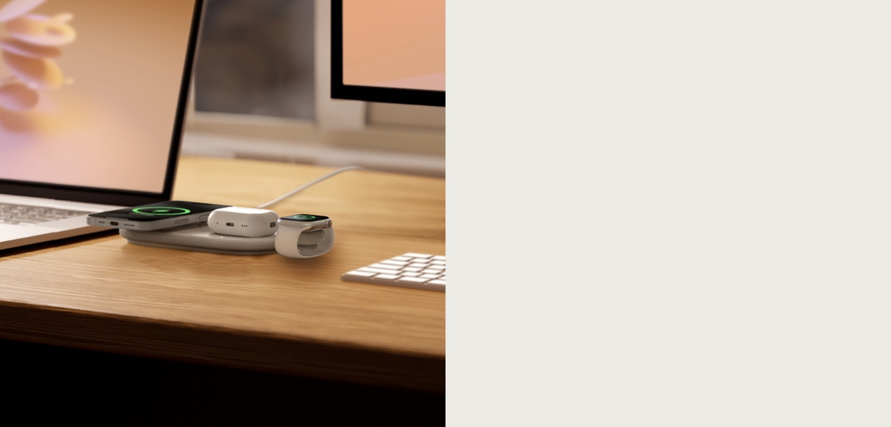 同時為兩個裝置無線充電。 在 Qi2 充電板上為您的 iPhone 提供高達 15W 的快速充電,在 Qi 充電板上為 AirPods 或其他裝置提供高達 5W 的標準快速充電。