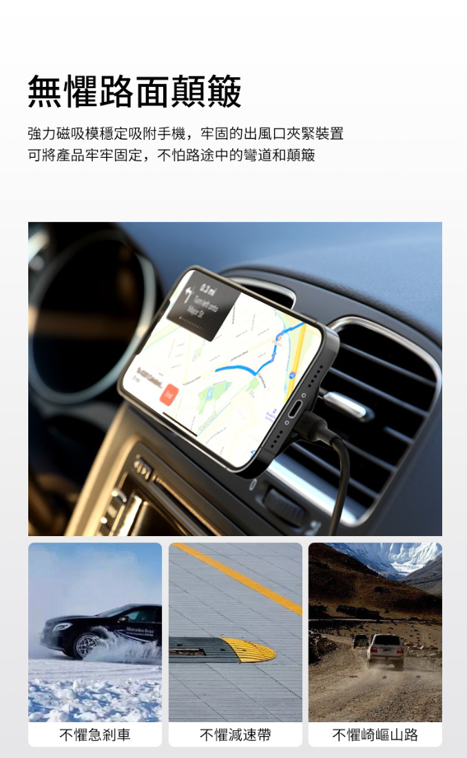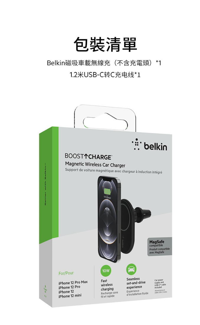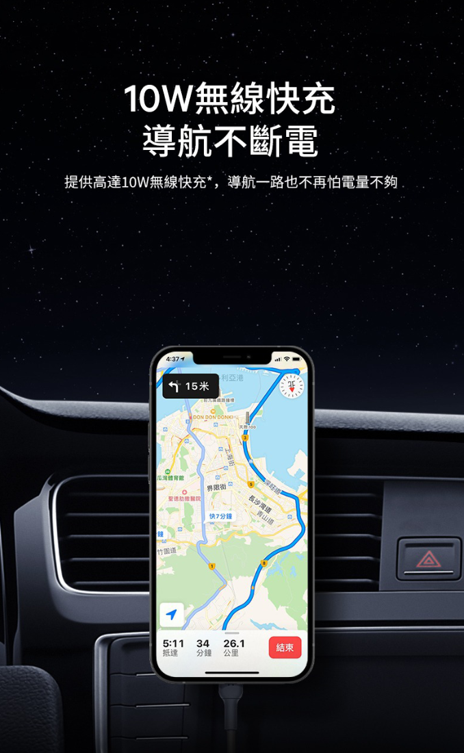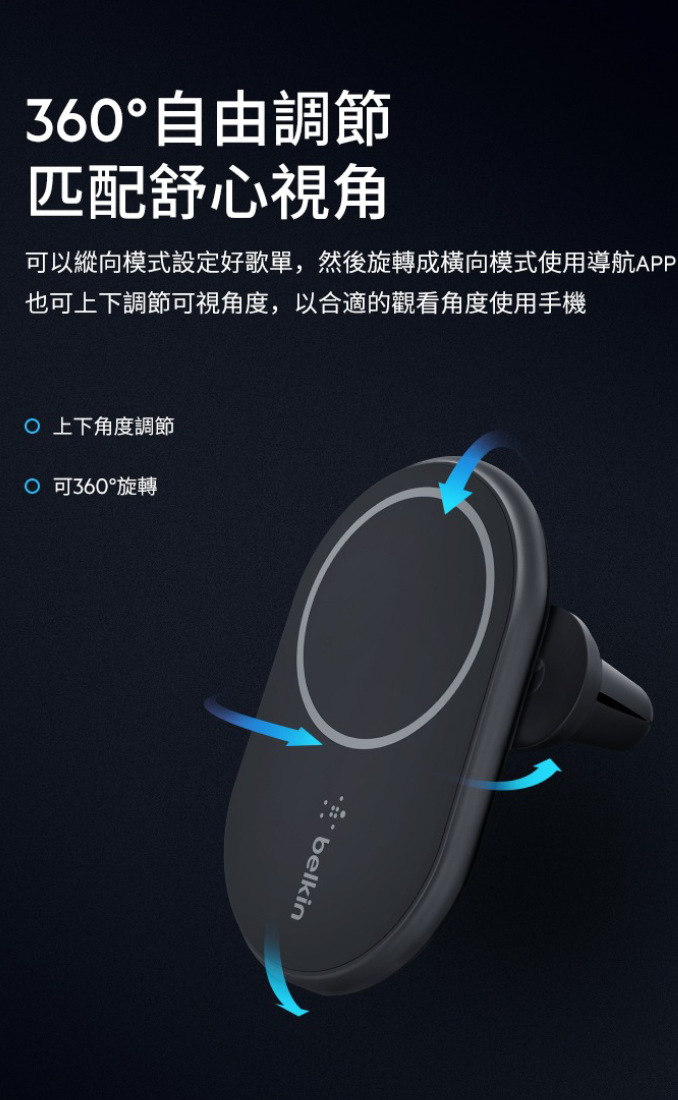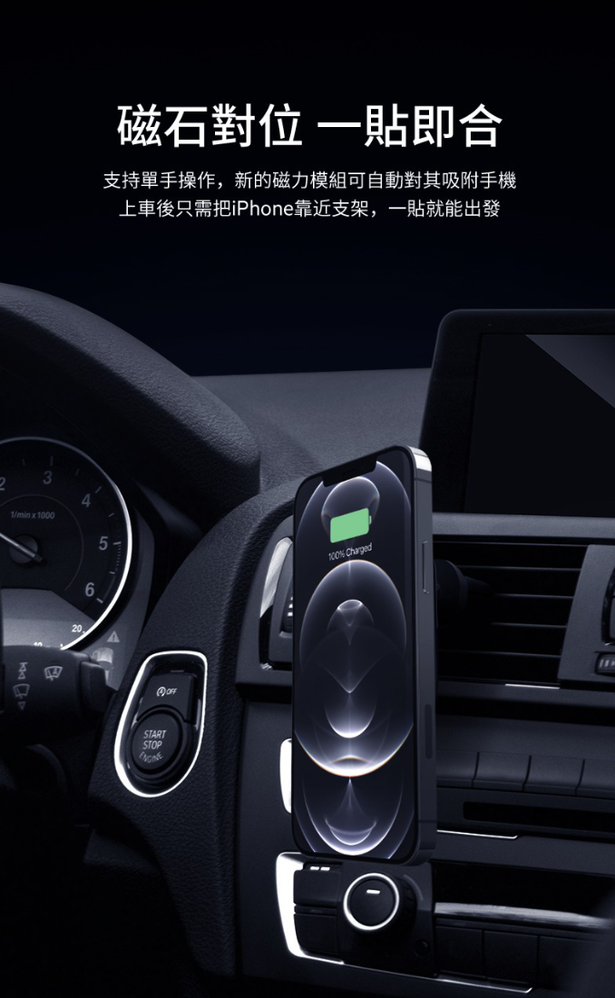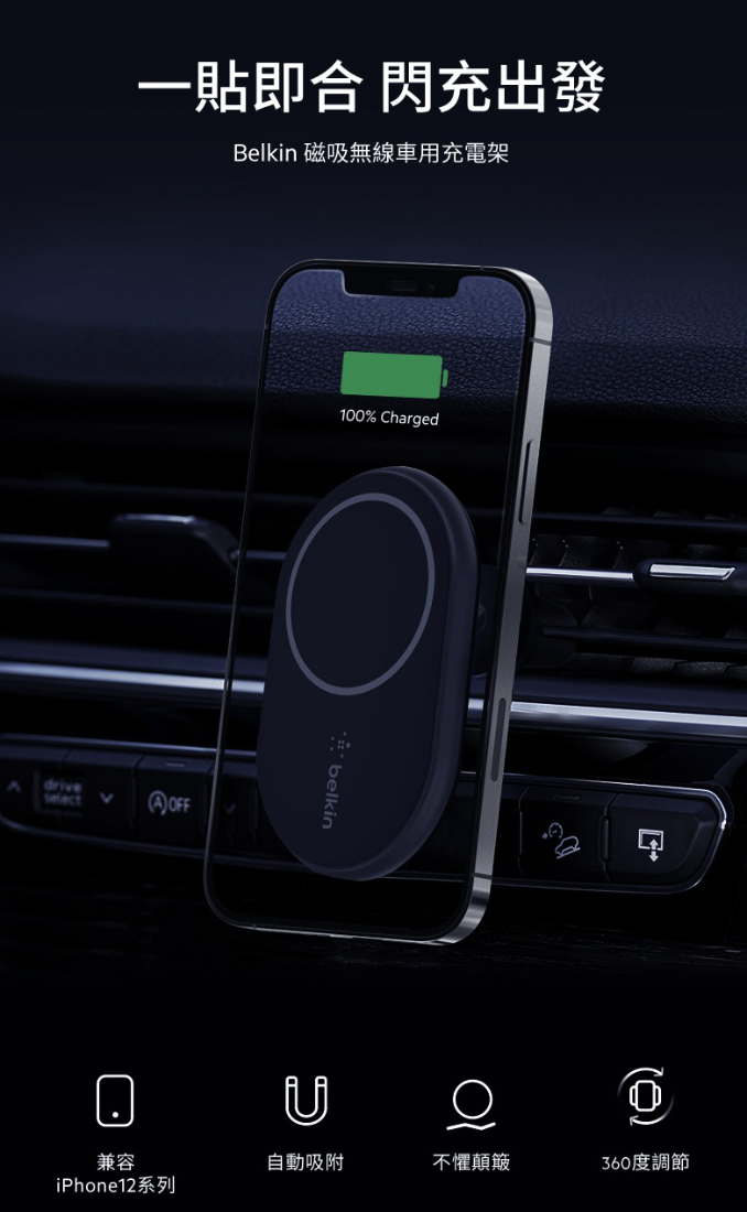 使用裝在汽車冷氣風口上兼容 MagSafe 的無線車用充電器,無論任意方向擺放,即可在車內為你的 iPhone 15 系列裝置充電,簡單又安全。 不包括電源適配器。