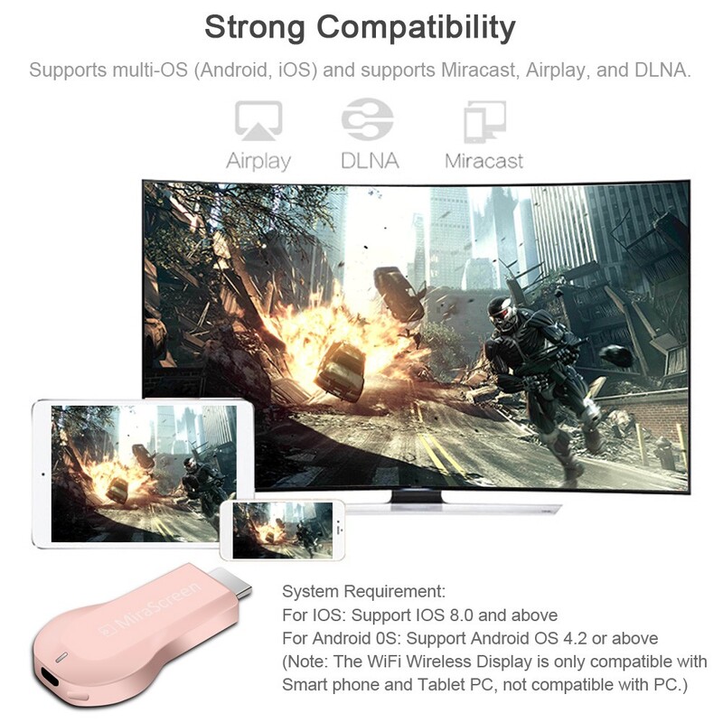 - 支持多操作系統(Android,iOS),並支持Miracast,Airplay和DLNA。適用於具有Airplay的iOS 8.0及更高版本設備以及具有Miracast的Android 4.2及更高版本。