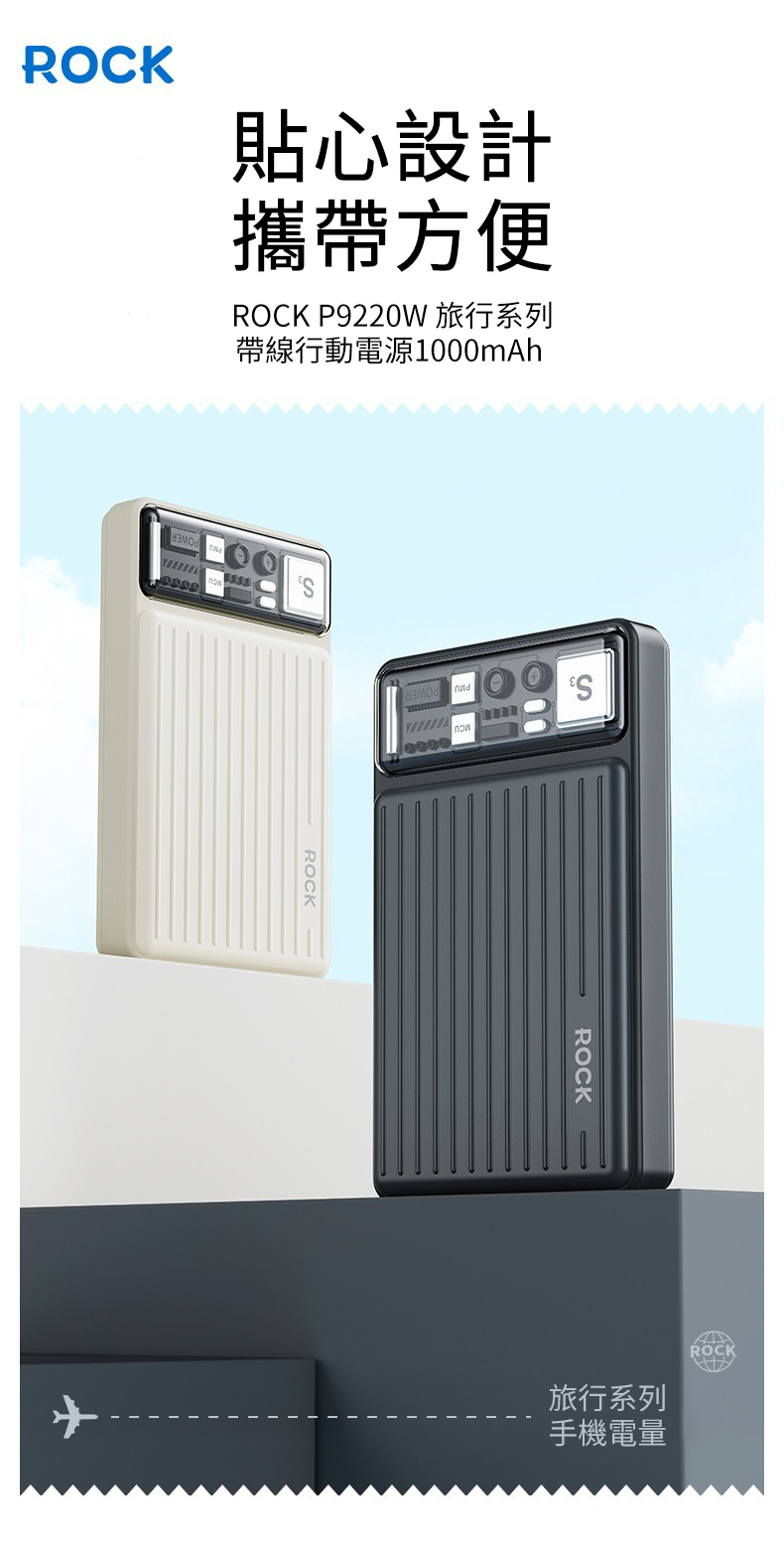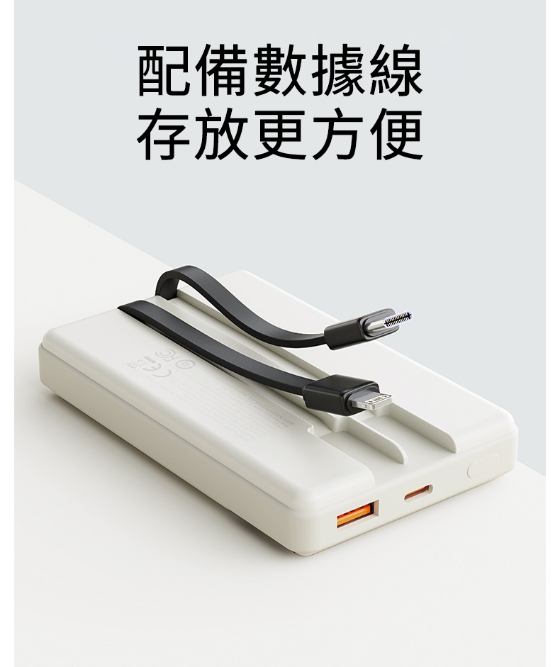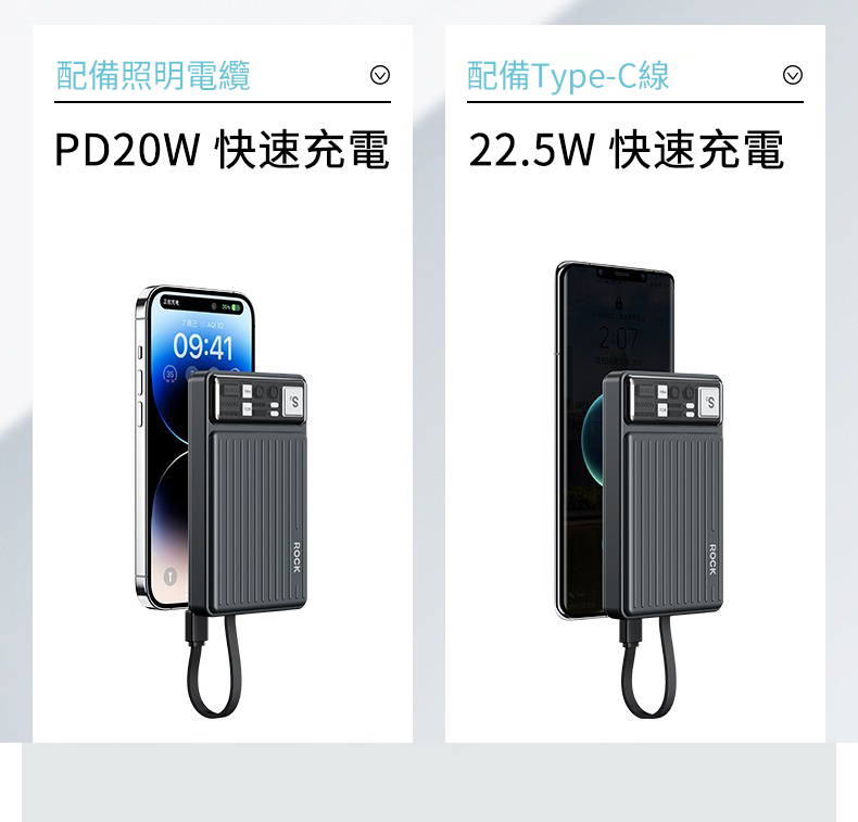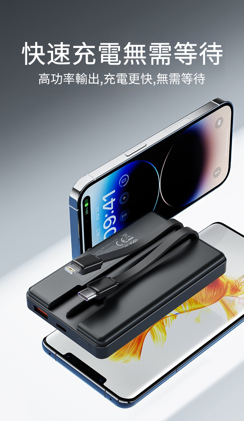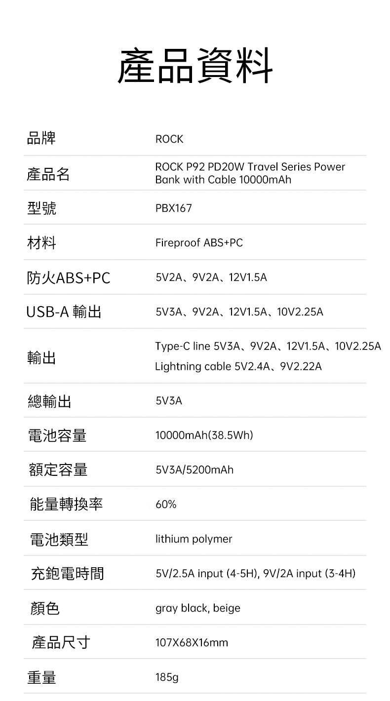 Rock -P92 10000mAh 超簿带線款行動電源 PD20W是一款時尚十足,自帶數據線的行動電,配有特大10000mAh大容量電池。簡約計設,容易收納,高彈線身柔韌耐拉。支持type-c, 22.5W快充、 lightning,PD20W快充,小巧便携,手感舒適,迎合你所需。