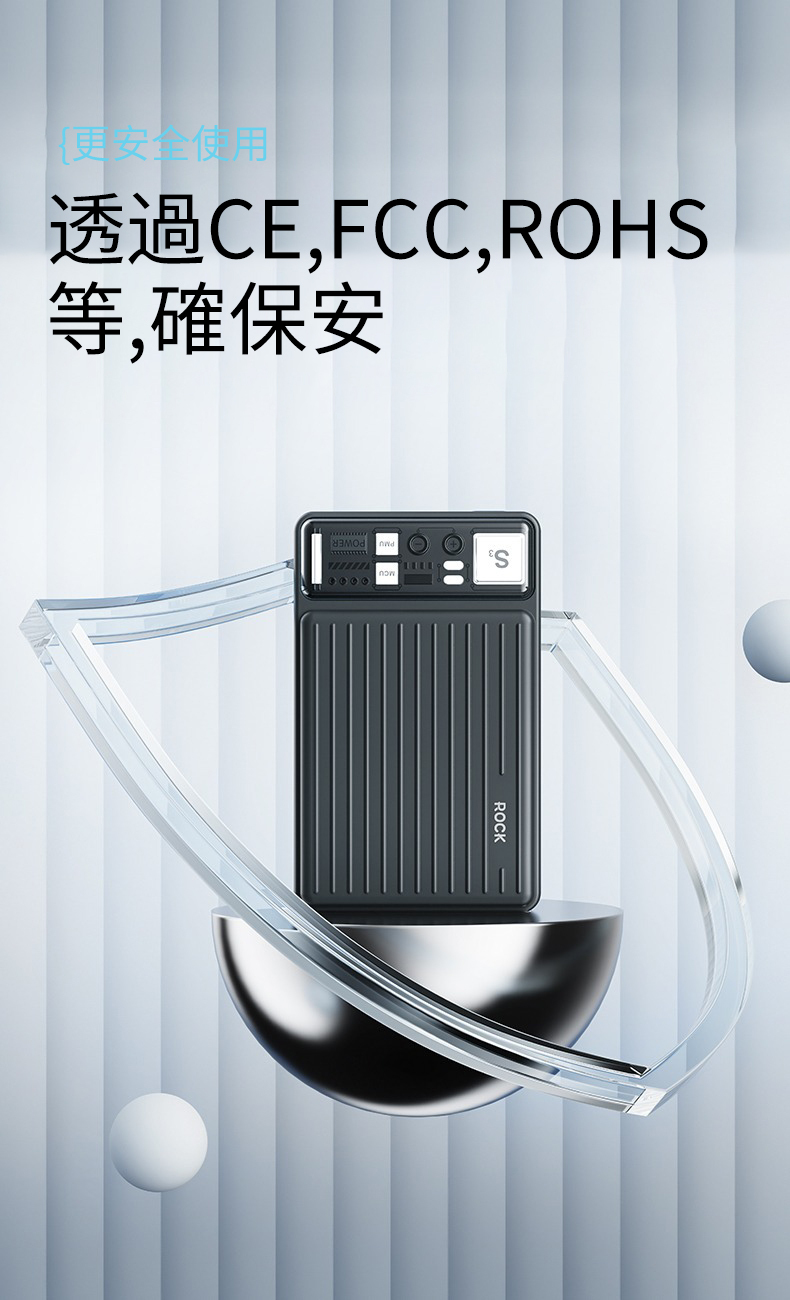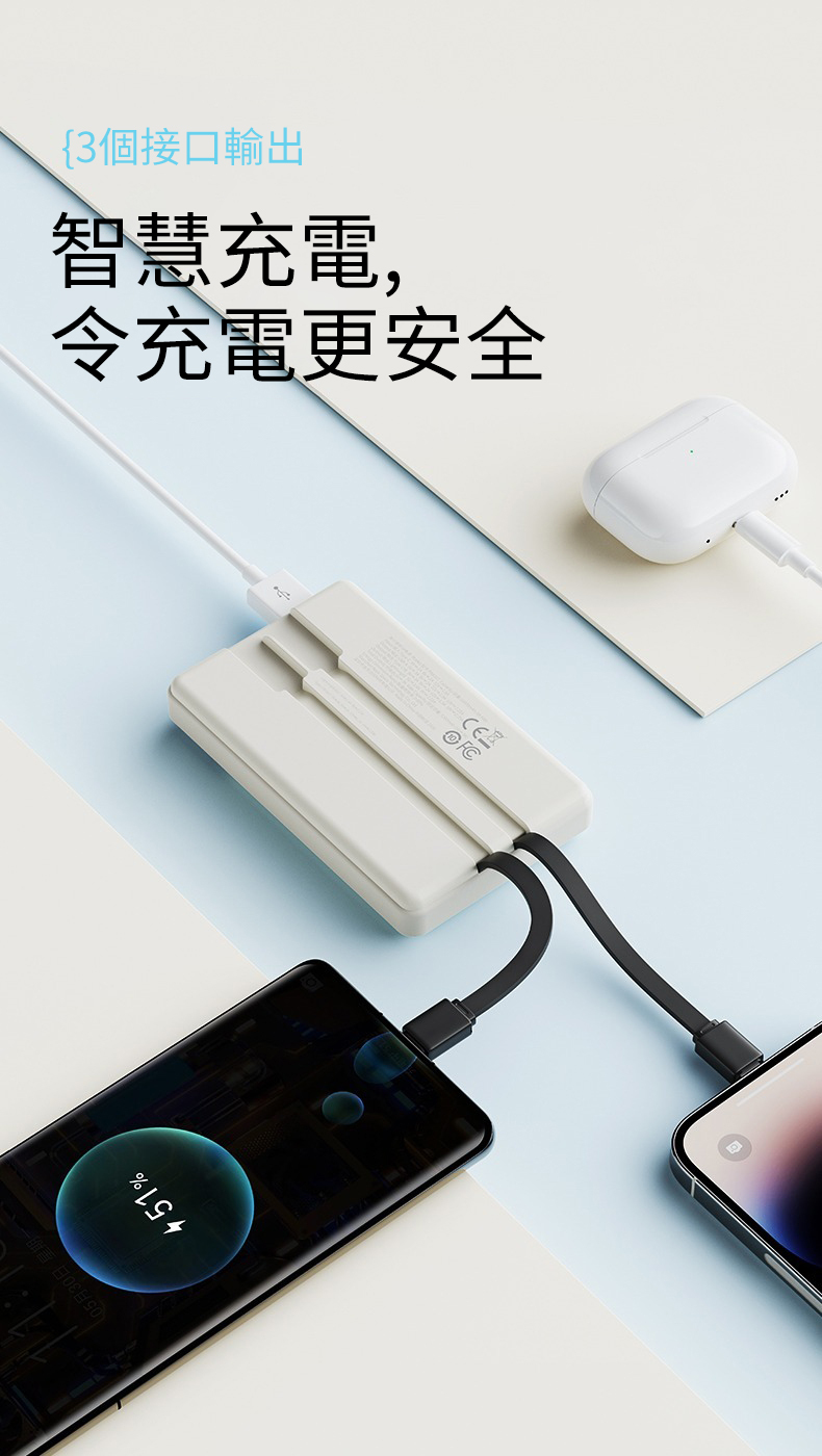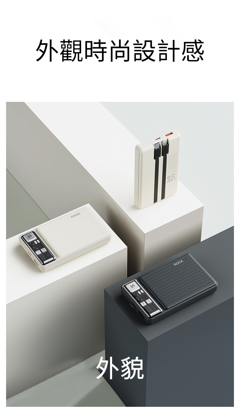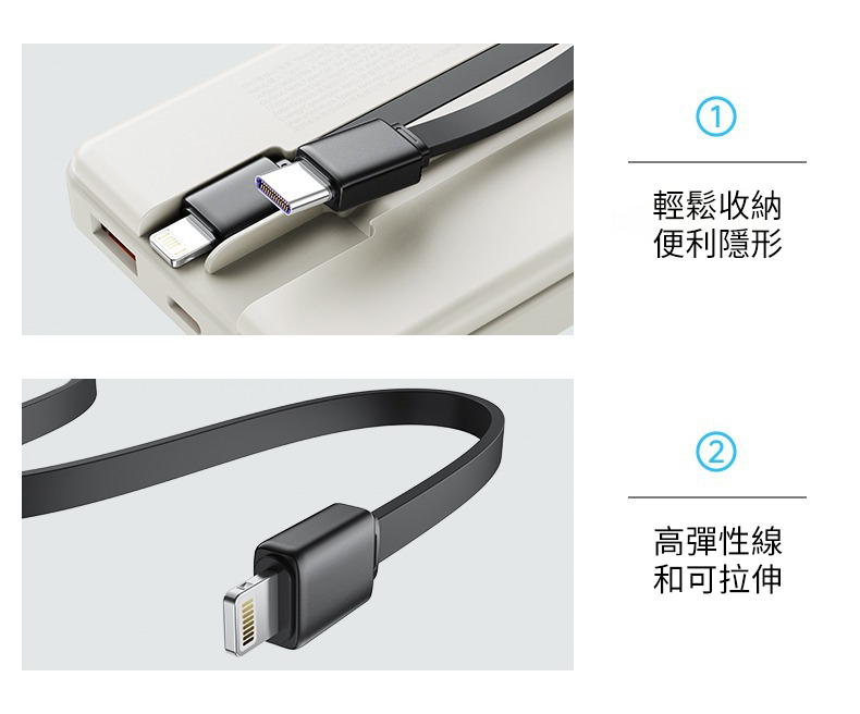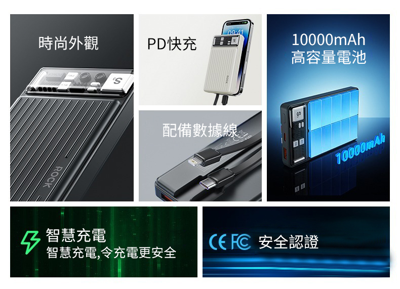Rock -P92 10000mAh 超簿带線款行動電源 PD20W是一款時尚十足,自帶數據線的行動電,配有特大10000mAh大容量電池。簡約計設,容易收納,高彈線身柔韌耐拉。支持type-c, 22.5W快充、 lightning,PD20W快充,小巧便携,手感舒適,迎合你所需。