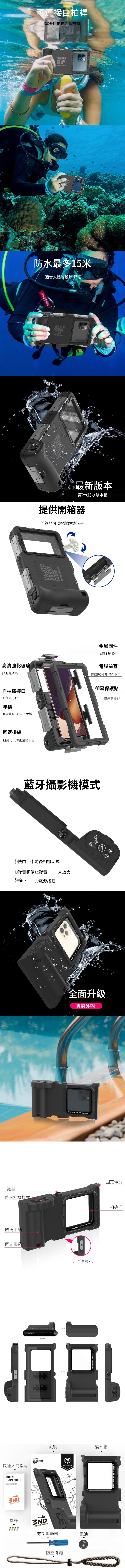 【藍牙遠程連接】第三代潛水殼摒棄了老式的機械相機設計,改用藍牙連接相機按鍵設計。 只需下載並打開'BT Shutter' APP(ISO)或'shellbox-bt' APP(Android),連接手機藍牙,然後使用非silp手柄上的藍牙相機控制器進行放大或 縮小並拍攝您想要的照片或視頻。