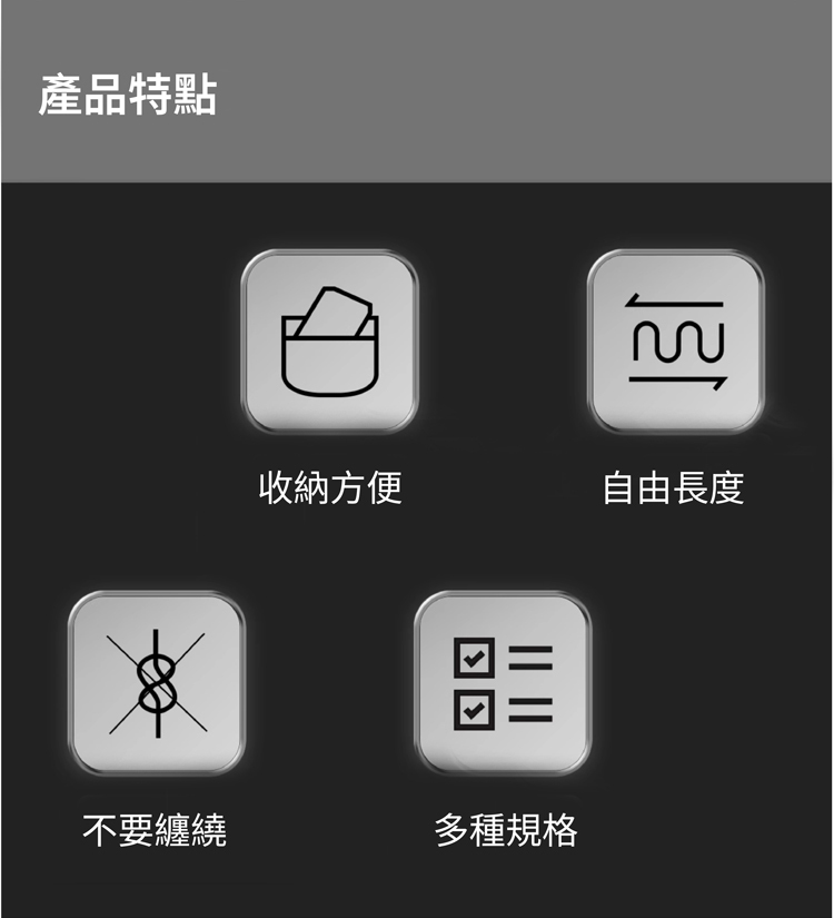 - 防纏繞:長度可調,易於存放,不會造成混亂