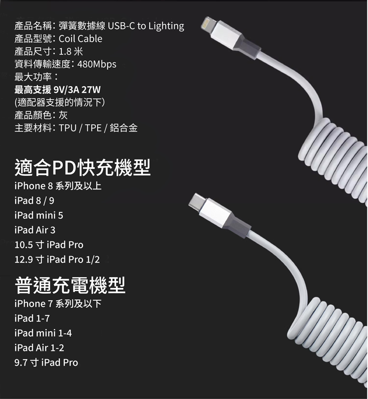 [Xpay優惠] TEGIC 彈簧款傳輸充電線/數據線 (TYPE C 連接 蘋果Lightning 連接頭)1.8m 27W
