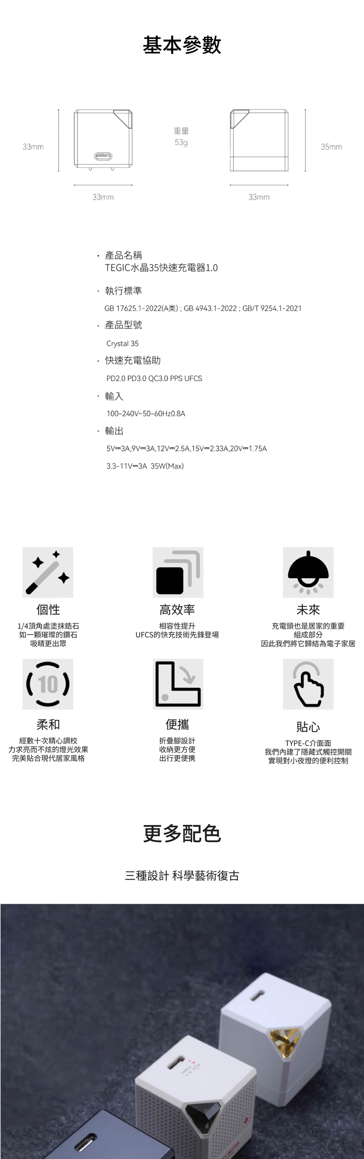 TEGIC CRYSTAL 35 充電頭 是一款使用與鉆石類似的鋯元素(ZrSiO₄),通過機器加工和手工拋光相結合的方式制成的充電頭,