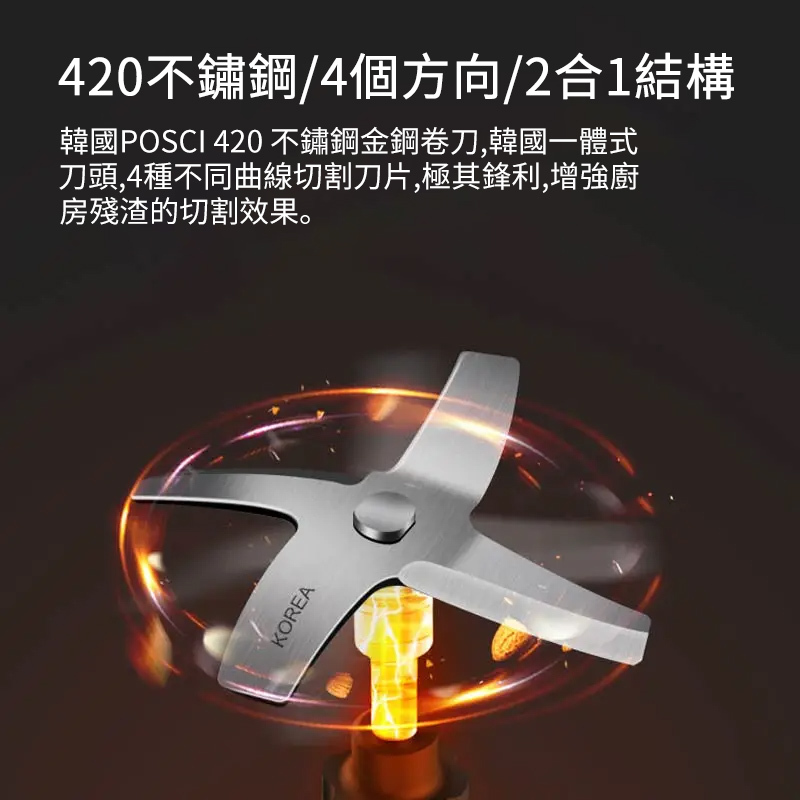 420 不鏽鋼,4向異弧切割刀片,刀片鋒利 ,有效達到廚房殘渣切割效果