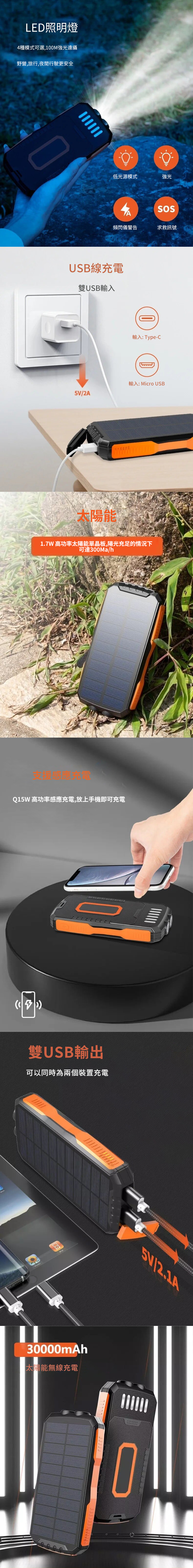 特點:無線充電,帶太陽能電池板,帶手電筒